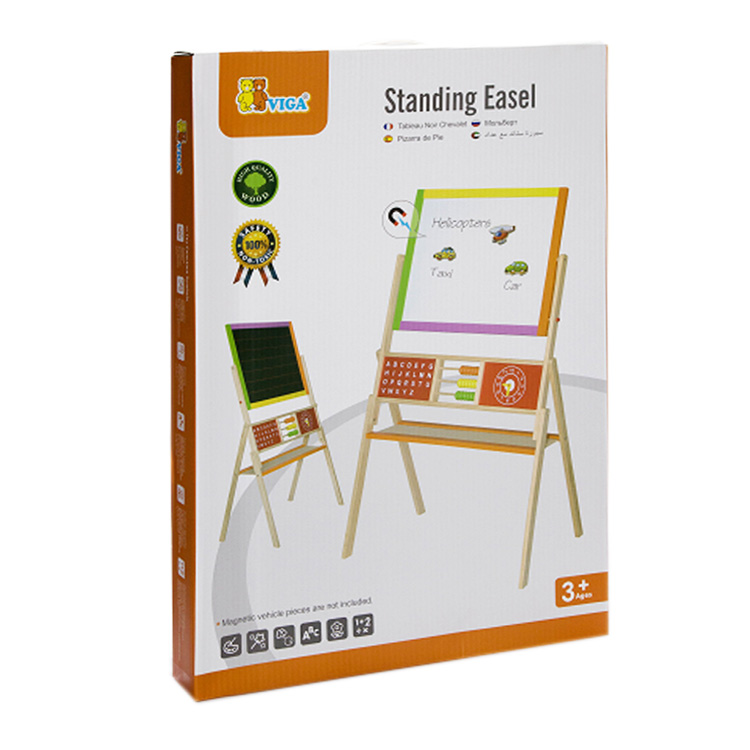 Удобный, практичный и функциональный деревянный мольберт от ТМ «Viga Toys» - развивающая игрушка, о которой мечтает каждый ребенок. Мольберт сделан из качественного дерева, что гарантирует безопасность малыша, позволит продлить время использования игрушки. Мольберт двухсторонний: с одной стороны – для рисования мелом, с другой – стираемыми маркерами. Также на доске есть отделение с английским алфавитом, счетами и часами, что является большим преимуществом для развлечений и обучения малыша.