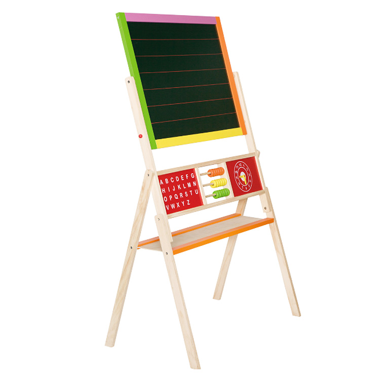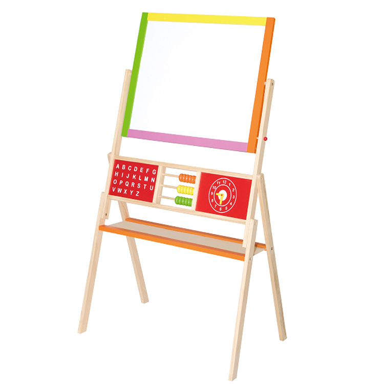 Деревянный, двухсторонний, магнитный мольберт с двумя рабочими поверхностями: для рисования мелом, маркерами и для игр с магнитами. На доске также размещены панель с английским алфавитом, счеты и часы. В комплект входят: мольберт-доска, мелки, маркер, губка для стирания.