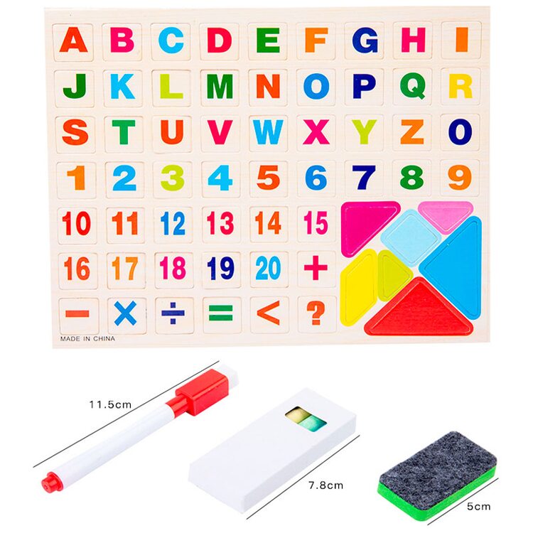 Доска оснащена удобной полочкой для принадлежностей. В комплект входят: мелки, маркер на водной основе, губка для стирания, магнитные буквы (англ. алфавит), цифры от 0 до 20, знаки и магнитный танграм.