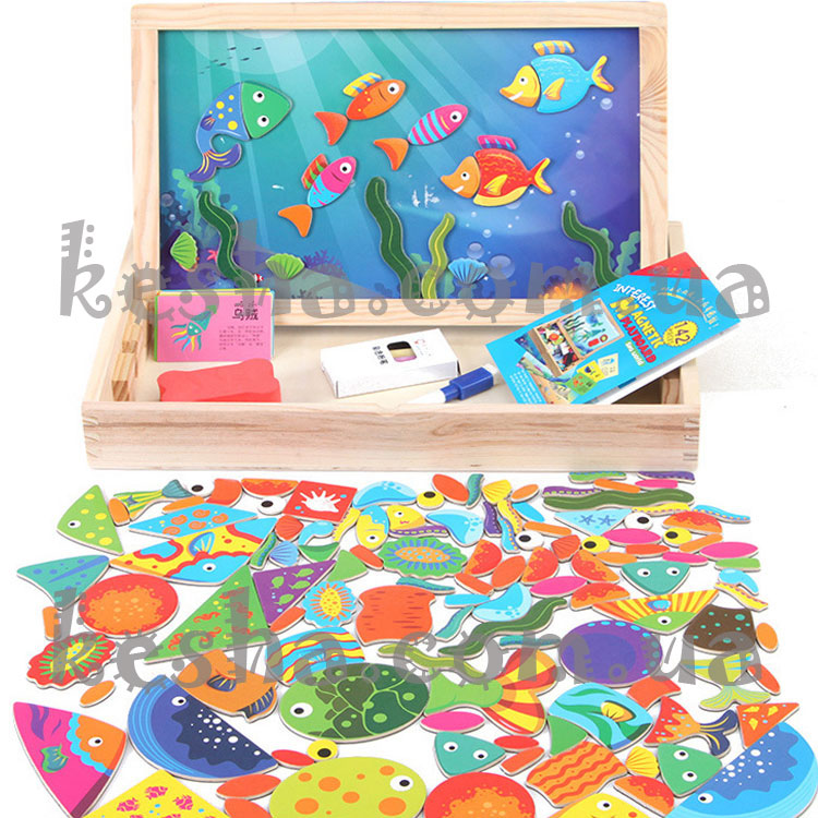 По примерах на картинке на цветном фоне моря необходимо собрать из деталей фигуры рыбок и других морских обитателей. Также с одной стороны досточки - мольберт для рисования маркером (маркер на водной основе и губка идут в наборе), а с другой стороны - мольберт для рисования мелом (мелки и губка идут в наборе).