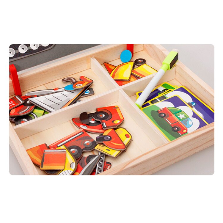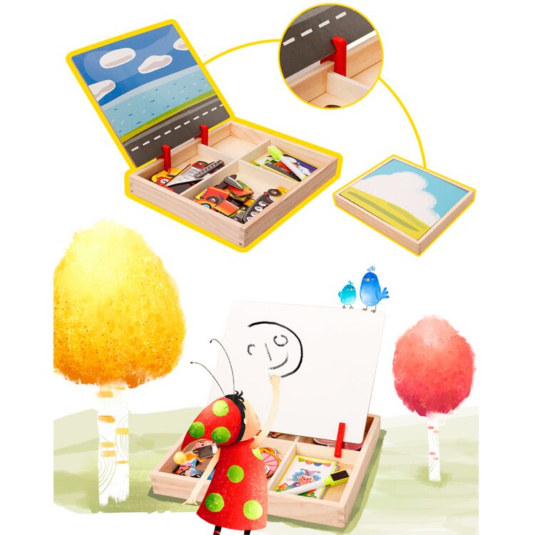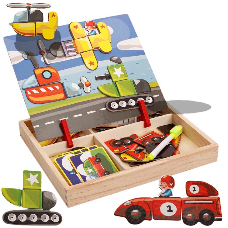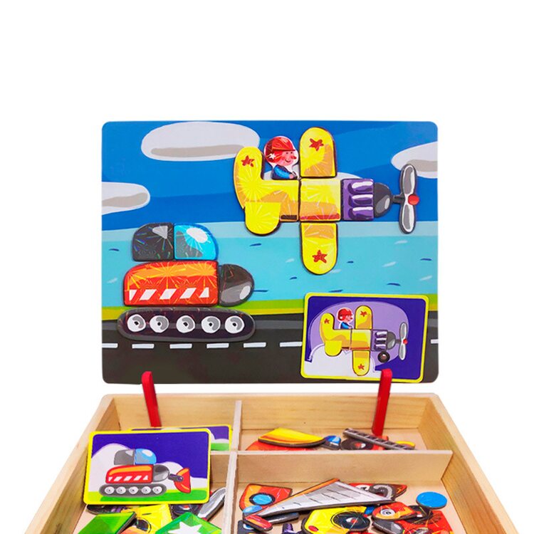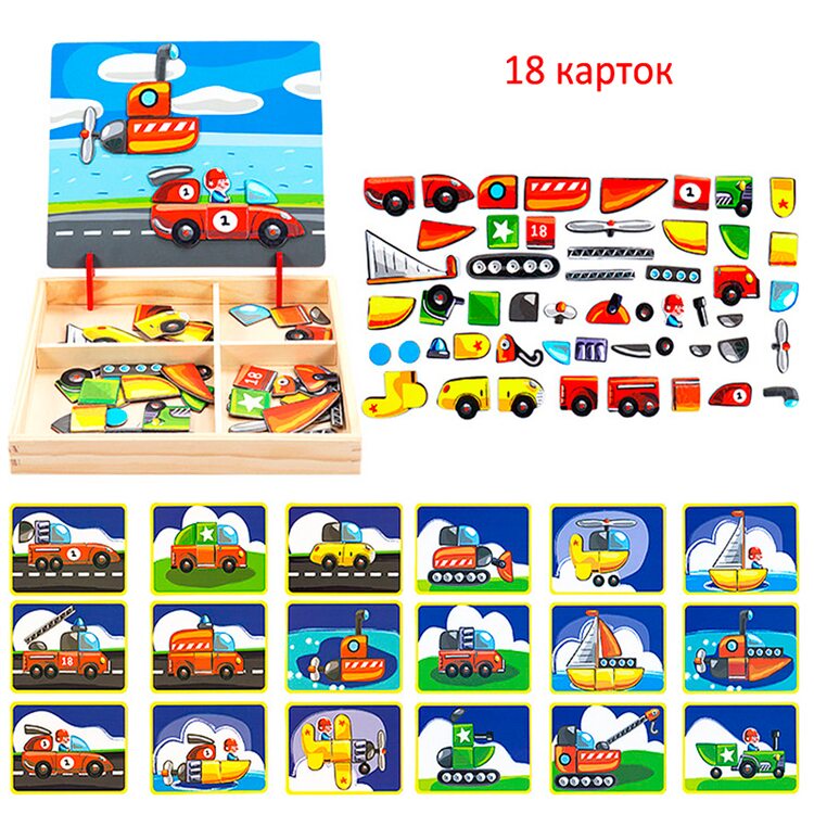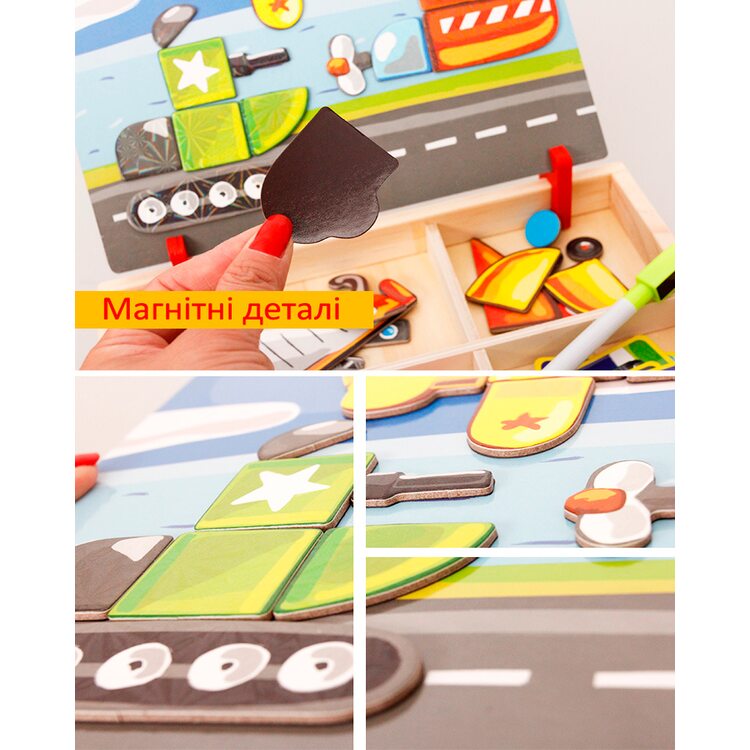 Набор очень понравился и ребенку и родителям. Добротная деревянная коробка, удобные крепления для магнитного экрана (устанавливается в двух положениях) , сам экран - очень плотная дощечка с металлической прослойкой и яркой картинкой с одной стороны и белый с другой. Магнитные детальки очень хорошего качества, яркие, с эффектом голограммы. В комплекте идут картинки-примеры -18 шт, но вариантов сборки значительно больше ( танк у нас превращался в звездолет, а потом в подводную лодку). Рекомендую. |