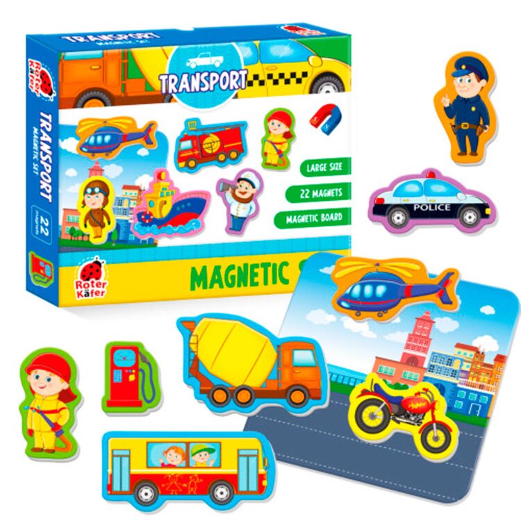 Поиграем в гараж? Для этого не обязательно нужно выходить на улицу. На магнитную доску выкладываете те машинки, на которых мы бы сейчас поехали в путешествие или за покупками. В наборе 22 магнита с различными видами транспортами, а также магнитная доска.