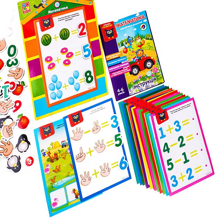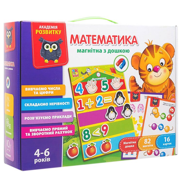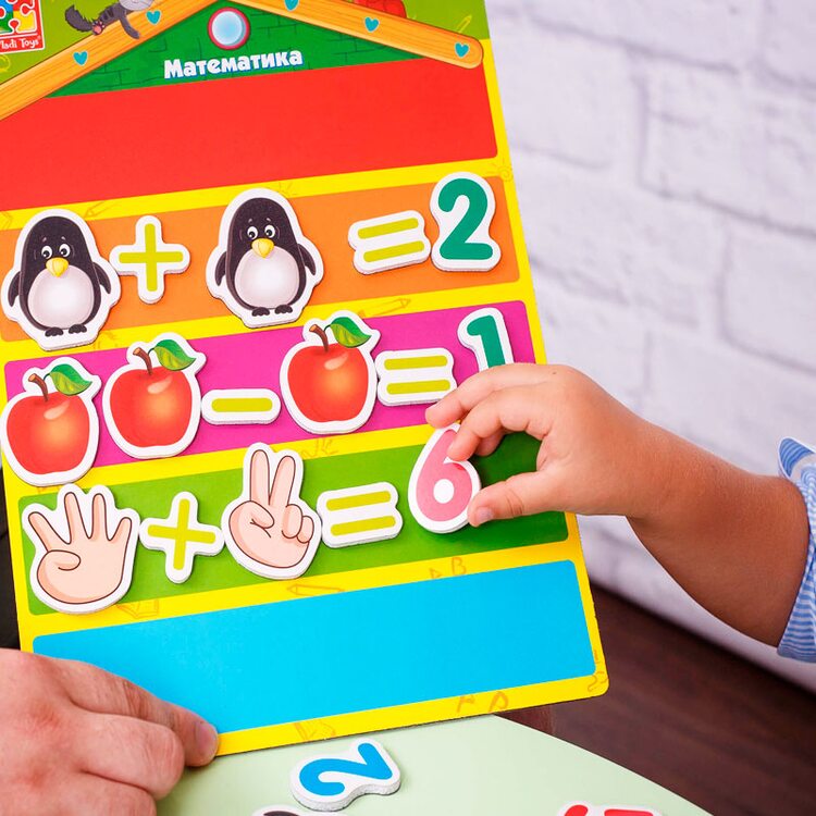 С таким набором знакомиться и учить математику легко и просто. В наборе 82 мягких магнитов 16 карточек с заданиями и магнитная доска. Рисунки на магнитах яркие и красочные. Учимся играя.