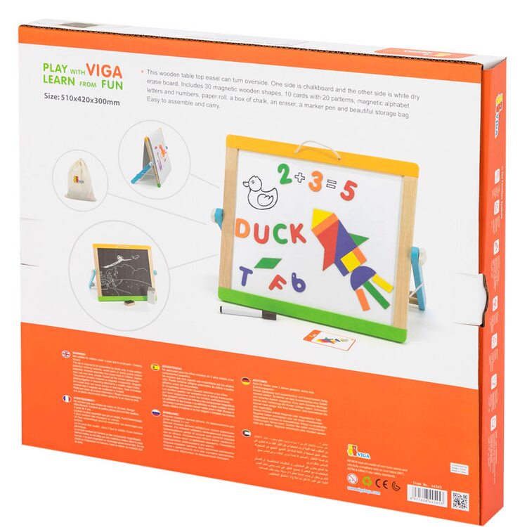 Школьная доска представляет собой устойчивый деревянный красочный настольный мольберт-планшет. Одна ее сторона магнитная (белая), предназначенная для букв, цифр и рисования фломастерами, вторая грифельная (черная) – для мелков. Доска оснащена креплениями, за которую доску можно удобно переносить доску или повесить ее на стену.