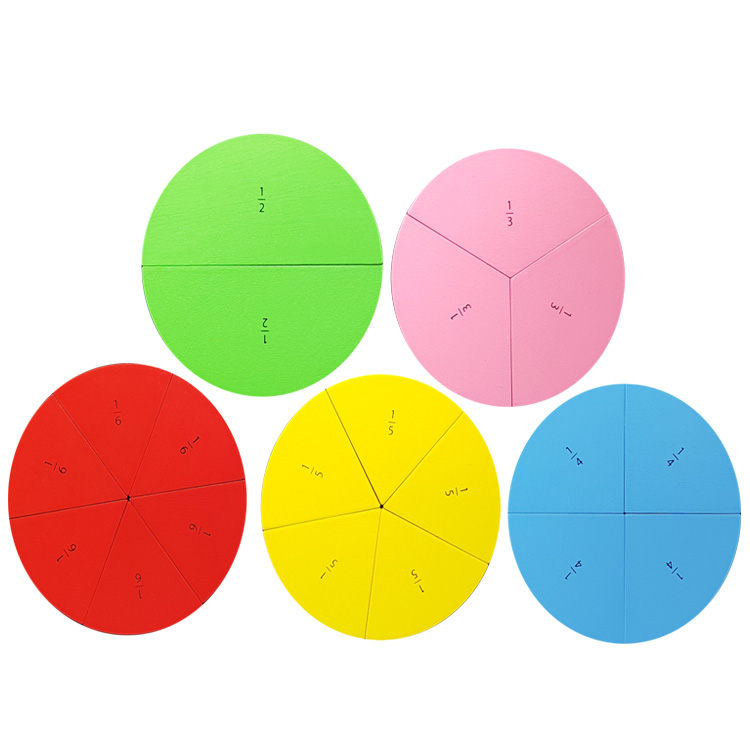 Дидактическая игра для изучения понятия "дроби", используя материал круглой формы. В комплект входят 5 кругов, которые маркированы по его частям и соответствуют значениям: 1/2, 1/3, 1/4, 1/5, 1/6. На обратной стороне материала прикреплены магниты для использования и демонстрации на магнитных досках.