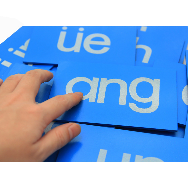 Светлые буквы выполнены на контрастном голубом фоне. Изображения букв песочные и по тактильным ощущениям отличаются от основного гладкого материала. Задача: приучить пальчик ребенка "выводить" буквы по правилам письма и соотносить их с определенными звуками.