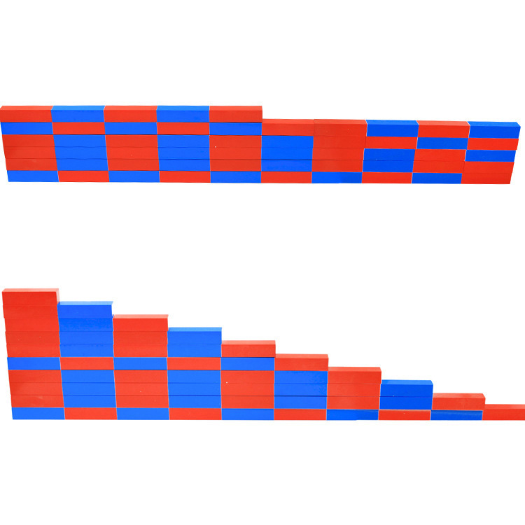 10 брусочков отличаются по длине. Каждый последующий элемент на 10 см короче предыдущего. Все бруски маркированы двумя цветами (цветной кусочек занимает ровно 10 см). Так наглядно представлены цифры первого десятка.
