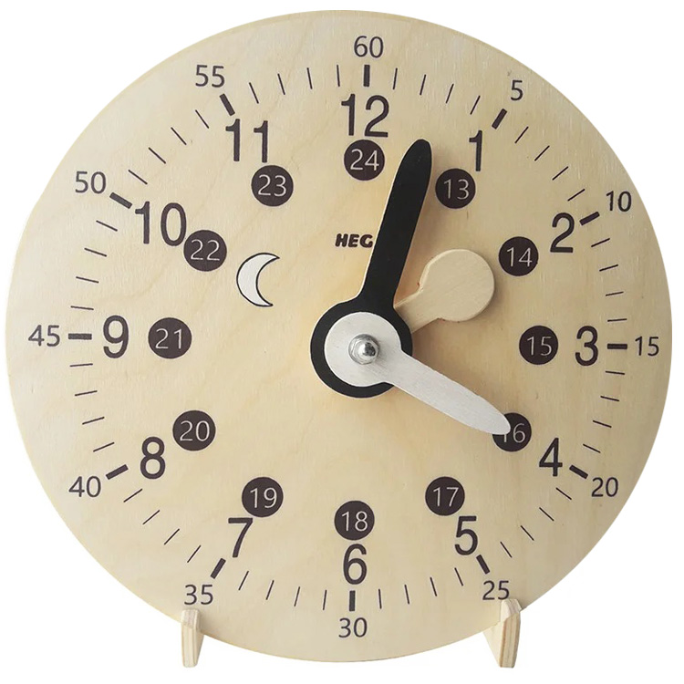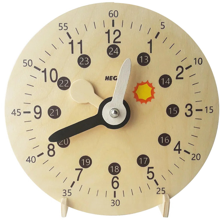 С такими часами Ваш ребенок сможет разобраться, который час, в понятиях времени: час, минута, секунда, четверть, половина и тд. Циферблат состоит из значений разного времени суток: дневное и ночное - 24 часовой формат. Как и в классических часах в данной модели есть 3 стрелочки: часовая, минутная и секундная.