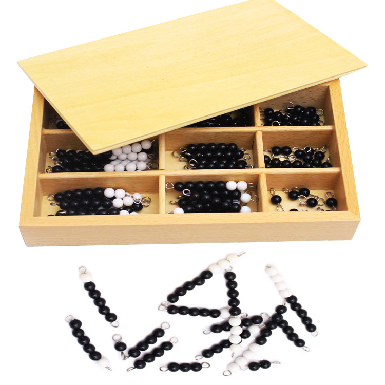 Счетный материал выполнен по методике Монтессори, помещен в деревянную коробку с внутренними отсеками. Так бусины удобно хранить и переносить из одной учебной зоны в другую.