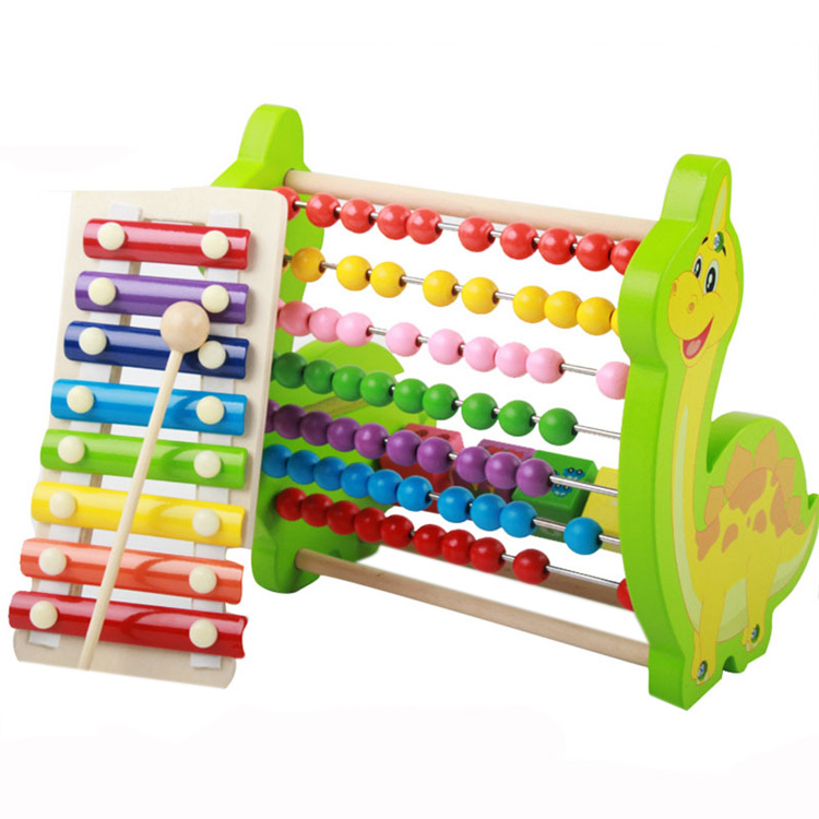 Проявлению музыкального слуха и математических способностей помогут счеты-ксилофон «Динозавр». Яркий и неординарный дизайн музыкальной игрушки привлечет внимание любого шалунишки, заставит на время оторваться от своих проказ. Симпатичный желтобрюхий динозаврик удерживает на своей спинке цветные горошинки, которые научат считать. Металлические плашки ударного инструмента будут издавать мелодичное звучание при каждом ударе.