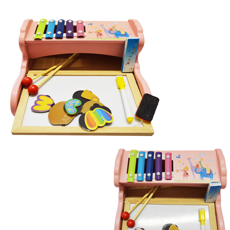 Предлагаем Вашему вниманию игрушку, которая включает в себя сразу нескоолько развивающих игр: доска для рисования мелками, маркерами и для игр магнитами, металлофон 5 тонов, набор магнитных деталей, из которых можно выложить множество различных картинок. Также в набор входят мелки, маркер и губка для стирания.