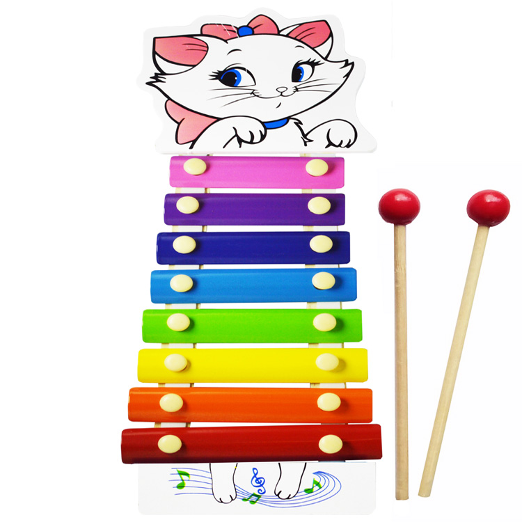 Деревянный ксилофон с металлическими плашками на 8 тонов. На основании прикреплена голова красивой кошечки с бантиком.