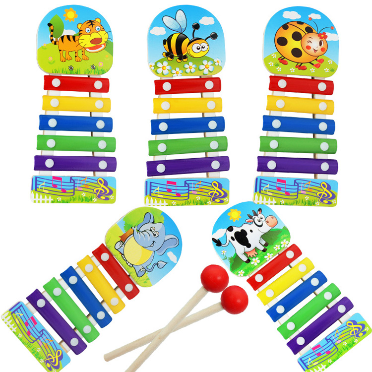 Мини ксилофоны на 5 тонов с разными картинками животных. Металлические плашки звучат звонко и громко. В набор входят две деревянные палочки.