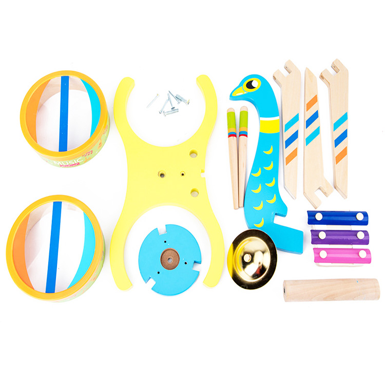 Все части музыкальной установки «Жар-птица» выполнены из дерева (за исключением металлической тарелки и «клавиш» на ксилофоне). Достоинство музыкальной игрушки в том, что она сочетает несколько музыкальных инструментов в одной. В комплект входят: