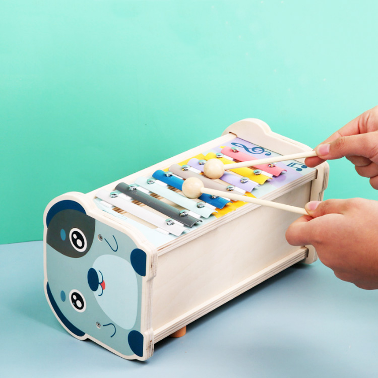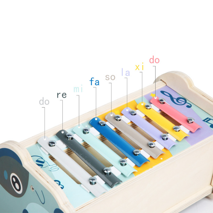 Три игры в одной игрушке: стучалка-рычажки, деревянный лабиринт с цифрами, металлофон 8 тонов.