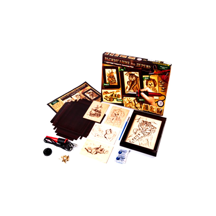 Набор для творчества, который поможет овладеть многими новыми навыками и способностями. В набор входят: электровыжигатель с подставкой и 6 насадок разной толщины для выжигания, 2 рамочки, 5 заготовок картин, инструкция, тонирующая краска и кисточка. Для создания своей картинки нужно сначала выжечь по контуру, а потом нанести на готовый рисунок тонирующую краску. Последним шагом в создании шедевра будет установка картинки в рамочку.
