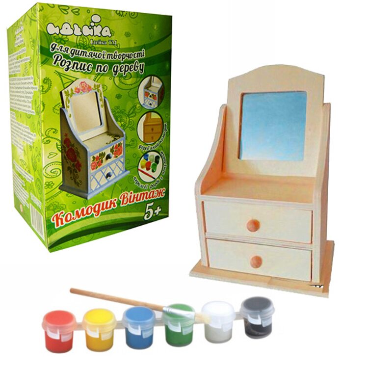 Набор для творчества "Комодик для принцессы" от торговой компании идейка станет отличным подарком для вашей маленькой модницы. Игрушка представляет собой небольшой деревянный комодик, со шкафчиками и зеркальцем. Отличный предмет мебели для куклы или мягкой игрушки. Но, есть небольшой нюанс - комодик не имеет на себе никакой росписи. Поэтому вашей малышке нужно самостоятельно довести до ума это изделие. С помощью акриловых красок, ваша кроха может создать необычайно красивый комод, аналогов которому не будет ни у одной девочки. Самое главное проявить фантазию и следовать велению своей детской души.