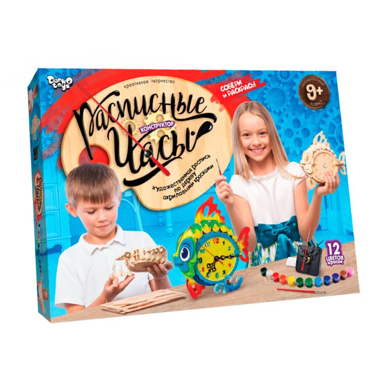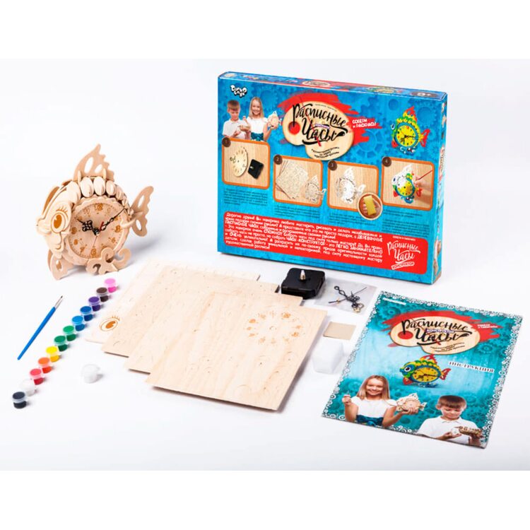 Прекрасный набор для развития творческих способностей Вашего ребенка. Для начала часики в виде рыбки нужно собрать как конструктор с деревянных деталей по номерам, согласно инструкции. Вставить поворотный механизм, чтобы стрелочки на часиках двигались. После сборки часиков, корпус нужно прогрунтовать белой краской с набора с помощью губки. А далее разукрасить как захотите.