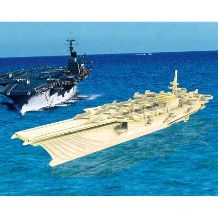 Набор состоит из фанерных пластин с прорезанными деталями для сборки объемной модели авианосца, внешне идеально напоминающей боевой корабль с взлетной полосой, самолетами, ракетами и т.п.