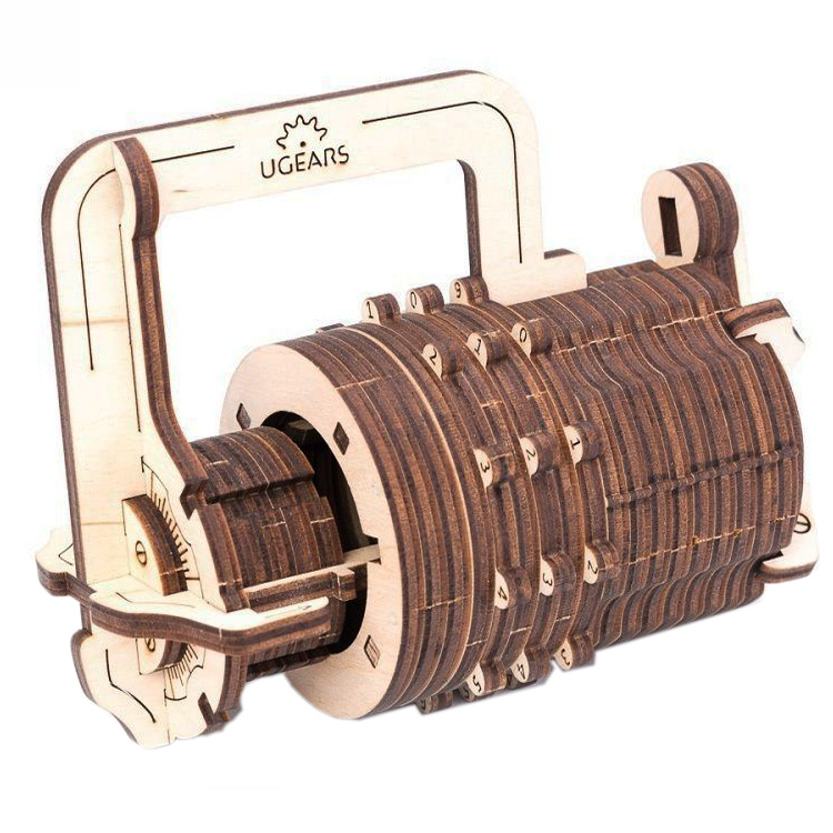 В детстве у каждого мальчишки или девчонки найдутся свои секреты. Механическая 3D-модель «Кодовый замок», состоящая из 34 деревянных деталей поможет надежно их хранить. Чтобы собрать не сложную объемную игрушку, потребуется ознакомиться с предложенной производителем инструкцией и соблюдать все имеющиеся рекомендации. Механическая 3D-модель «Кодовый замок» ТМ Ugears вполне функциональна. Стоит придумать собственный код из комбинации 3-х цифр и кроме вас никто не сможет открыть замок. Угадать одну из 1000 комбинаций довольно сложно, так что ваша секретная информация останется при вас. Естественно, что конструкция не только интересна в процессе сборки, но и подарит настоящее эстетическое наслаждение от своего внешнего вида симпатичного сувенира. Маленькие инженеры будут рады получить в подарок оригинальный комплект для самостоятельной работы с неокрашенными фанерными деталями.