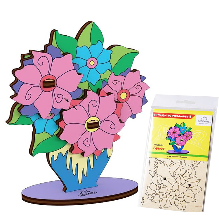 Чтобы разнообразить досуг дошкольника и всячески развивать его творческие способности, купите сборную 3D-модель «Букет» от ТМ Ugears. При работе с объемной игрушкой мальчик или девочка приложат максимум усилий, креатива и фантазии, чтобы самостоятельно оформить и оригинально разукрасить поделку из натуральной древесины. Сборная 3D-модель «Букет», состоит из 8 отдельных, неокрашенных деталей. Симпатичная фигурка после сборки требует раскраски. С помощью кистей, акварельных красок, гуаши, восковых карандашей, маркеров или ярких фломастеров, сынишка или доченька создадут настоящий шедевр, который смогут подарить маме, бабушке, сестре или подружке. При раскрашивании можно ориентироваться на предложенный образец, или подбирать оттенки цвета самостоятельно. Если в работе не все получается гладко с первого раза, ничего страшного, ведь это всего лишь приобретение определенного опыта в работе. В дальнейшем ребенку еще не раз придется собственноручно что-то мастерить, вырезать, клеить и раскрашивать.