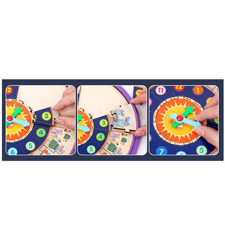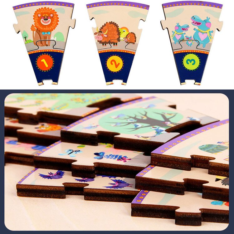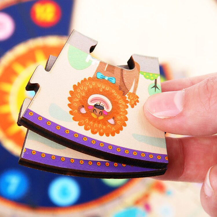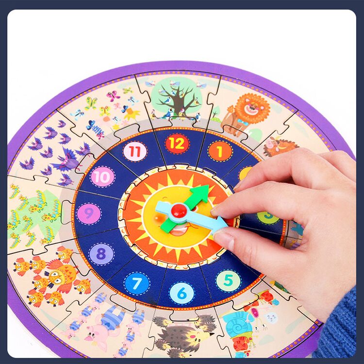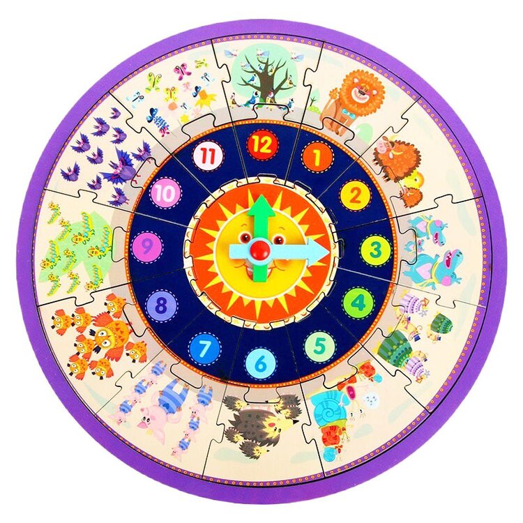 Часы, которые состоят из 25 деталей пазла, который нужно сложить. На деталях пазла изображены цифры от 1 до 12, а также рисунки разнообразных животных количество которых соответствует цифре на циферблате.