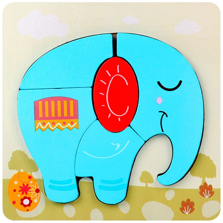 Вкладыши-пазлы с объемными фигурами в виде голубого слоника. Основание под слоном без подсказки, чем усложняется задача для малыша.