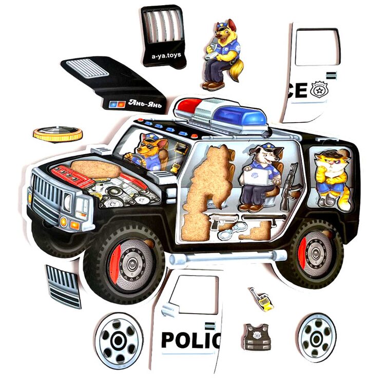 Большого размера пазл с реалистичным внешним видом полицейской машины. Пазл состоит из 25 деталей разного размера. Поспеши собрать все детали и вперед на охрану порядка в своей комнаты или дома.