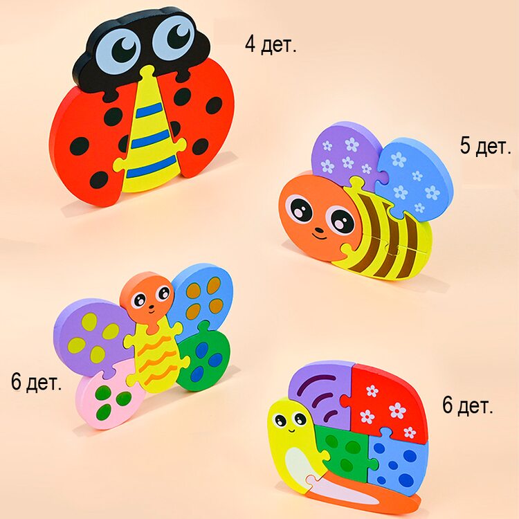 На основании расположились 4 вида насекомых, которые состоят из множества деталей. Сразу не разобраться, какие части съемные, а какие - являются неотъемлемой принадлежностью общего фона. Эти своеобразные пазлы помогут ребёнку собрать красочное изображение бабочки, божьей коровки, улитки и пчелки. Задача малыша – просто правильно расставить цветные детали в ячейки.