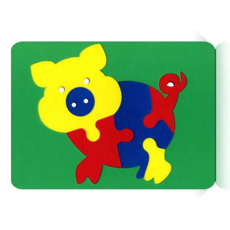 Мозаика состоит из основы и 6 элементов разных по размеру, цвету. Детали мозаики сделаны в виде пазлов, которые нужно правильно собрать, чтобы получилась картинка с симпатичной свинкой.