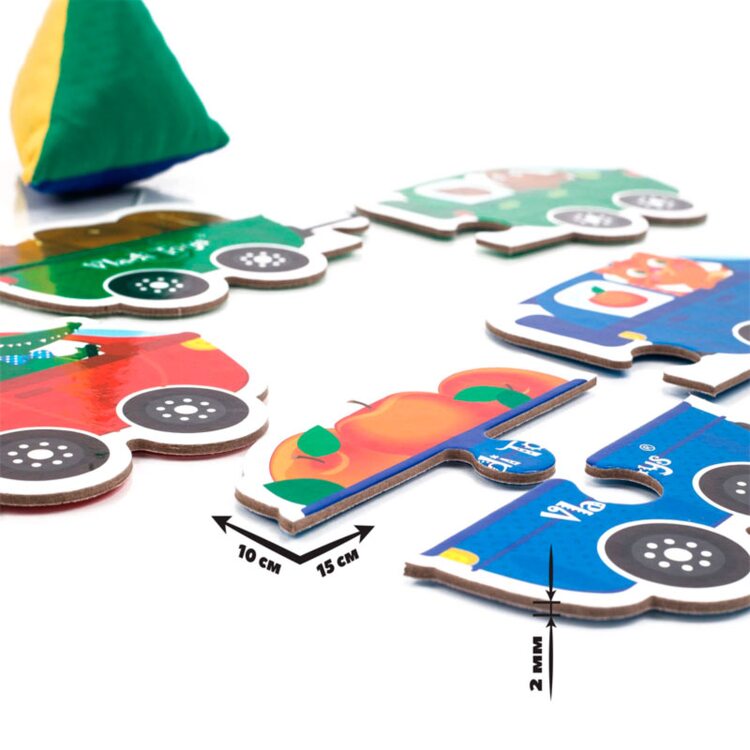 Интересная игра для малышей «Вагончики-фургончики». Наш паровоз необычный: он состоит из 3-х частей-пазлов, которые нужно собрать. К каждому цветному паровозику есть свой вагончик, который перевозит свой груз, который состоит из различных фруктов и овощей. Выбирай цвет фургончика с помощью цветной мягкой пирамидки, затем подбери к нему правильный вагончик. Вагончик должен соответствовать по цвету паровозика-фургончика и перевозимому грузу. Предложите ребенку посчитать количество предметов, которые размещены на вагончике. В процессе игры, ребенок и познакомится с различными фруктами и овощами, научиться считать.