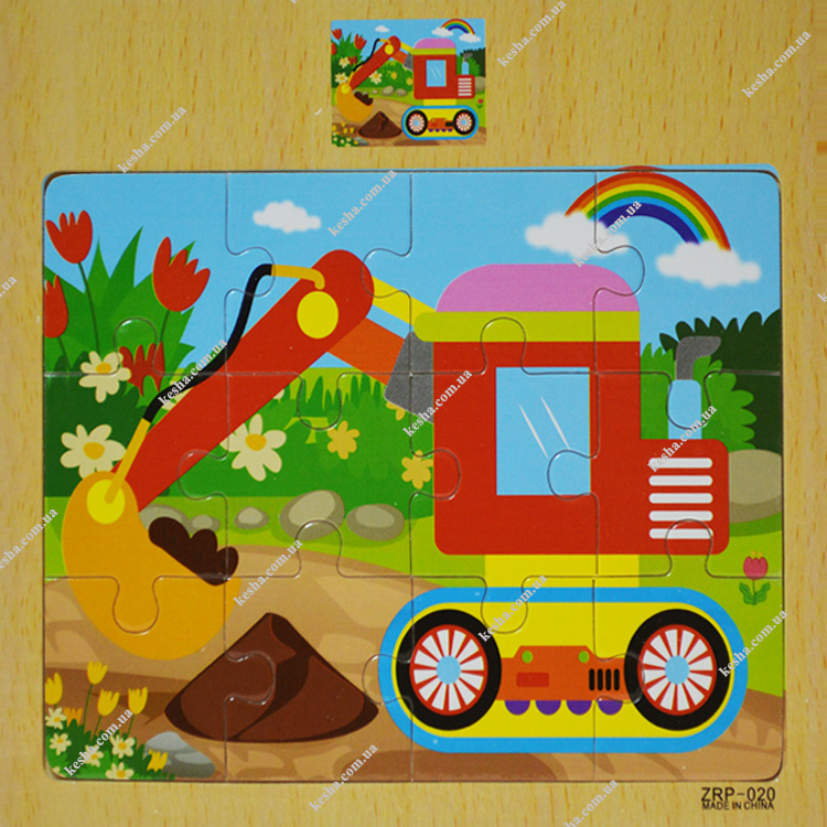 Пазл с красочной картинкой экскаватора, которая состоит из 12 деталей.