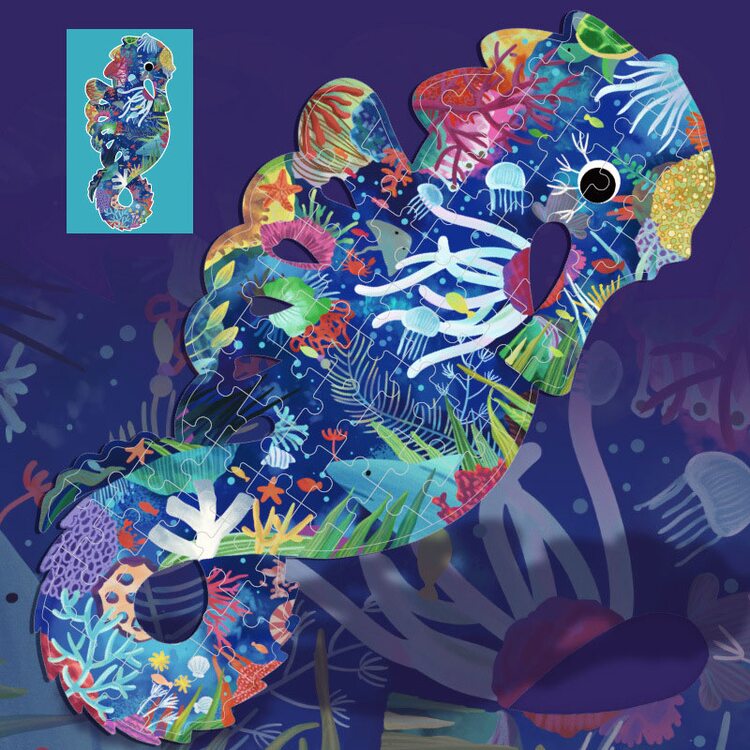 Красочный пазл, который показывает морского конька в новом, необычном образе, который объединяет мир морских глубин.