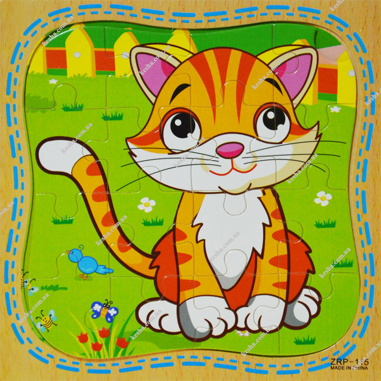 Симпатичный рыжий котенок на деталях пазла ждет, чтобы собрали его картинку.