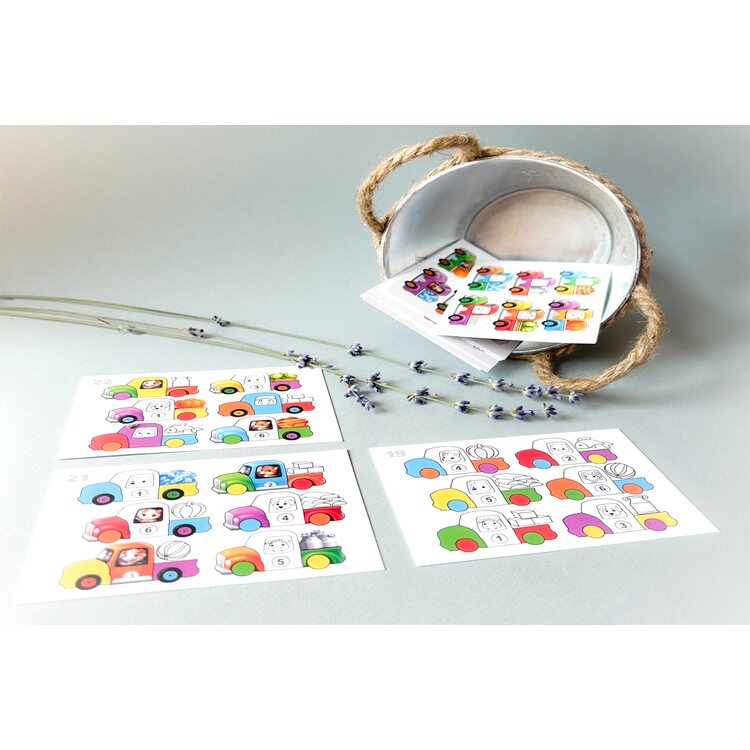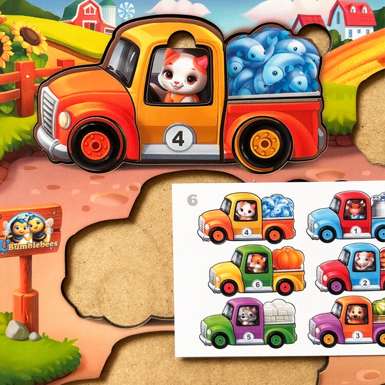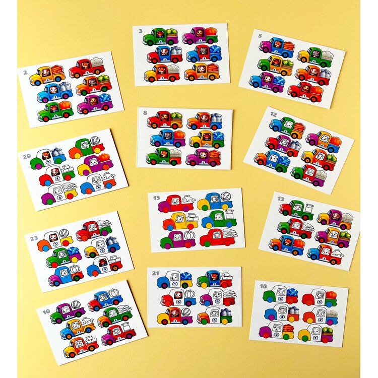 Пазл с заданиями «Животные на грузовиках» (лето) - это удивительно красивая и яркая игрушка-конструктор. Он представляет собой набор деталей (42 шт.), из которых нужно выложить грузовички, а также 24 задания (12 двухсторонних картонных карточек) разного уровня сложности (подробнее смотрите в видео к игре). Набор очень удобен в сборке.