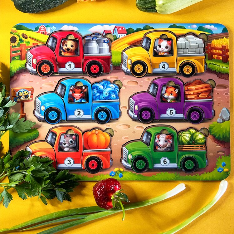 Грузовички различаются между собой по цвету и грузом, который перевозит. Цвет груза 3-х грузовиков соответствует цвету самого грузовичка. Поэтому игрушка позволяет познакомится поближе с цветами и ассоциациями.