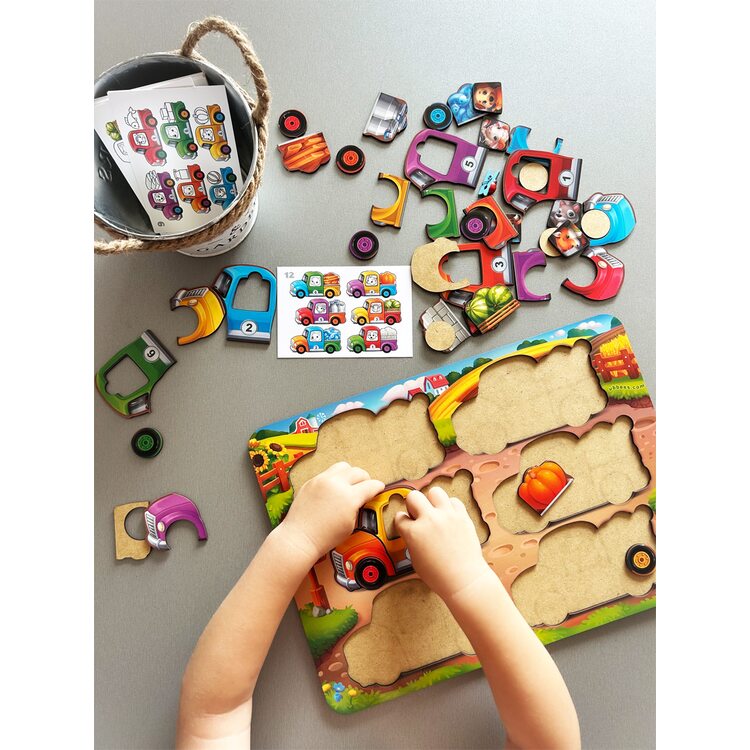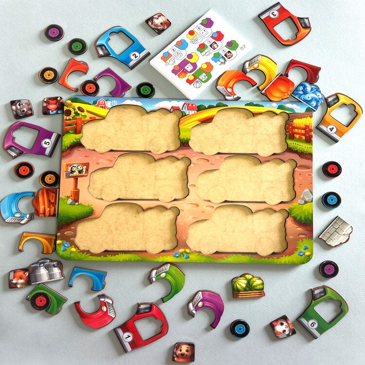 Чтобы сложить правильно пазл, нужно внимательно вначале посмотреть картинку и запомнить как она выглядит. А потом достаточно отыскать необходимые детальки и объединить их между собой. После сбора всех элементов можно начинать игру с ними. Хорошо играть с конструктором не просто в одиночку, но коллективно. Если есть несколько детей, они могут собирать пазл одновременно (каждому по машинке) или вместе считать машинки, рассказать истории или сочинять новые.