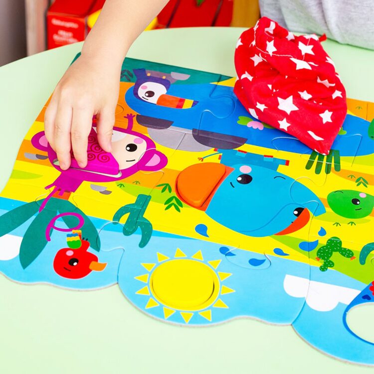Деревянные фигуры вставляются в определенные места в пазле и ребенок должен самостоятельно по форме определить, где для какой фигуры место.