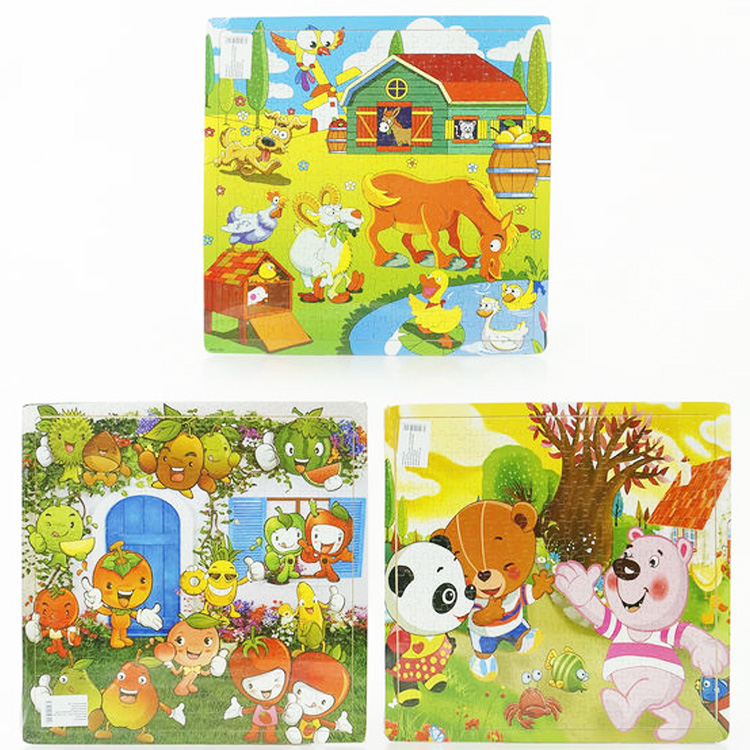 Пазлы представлены в трех видах с изображением домашних животных фермы, мишек и веселых фруктов-овощей.