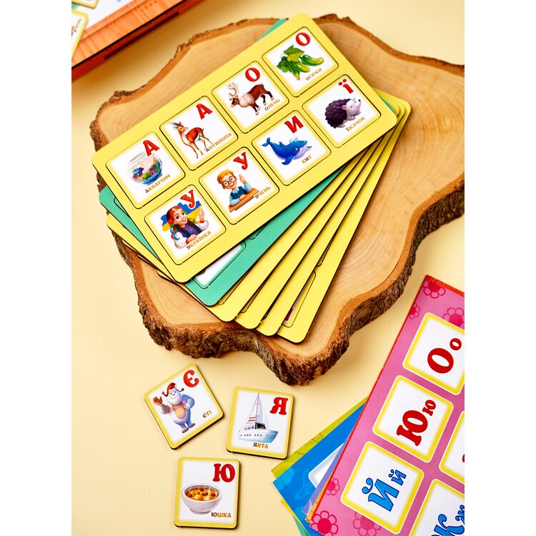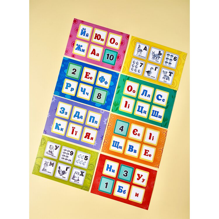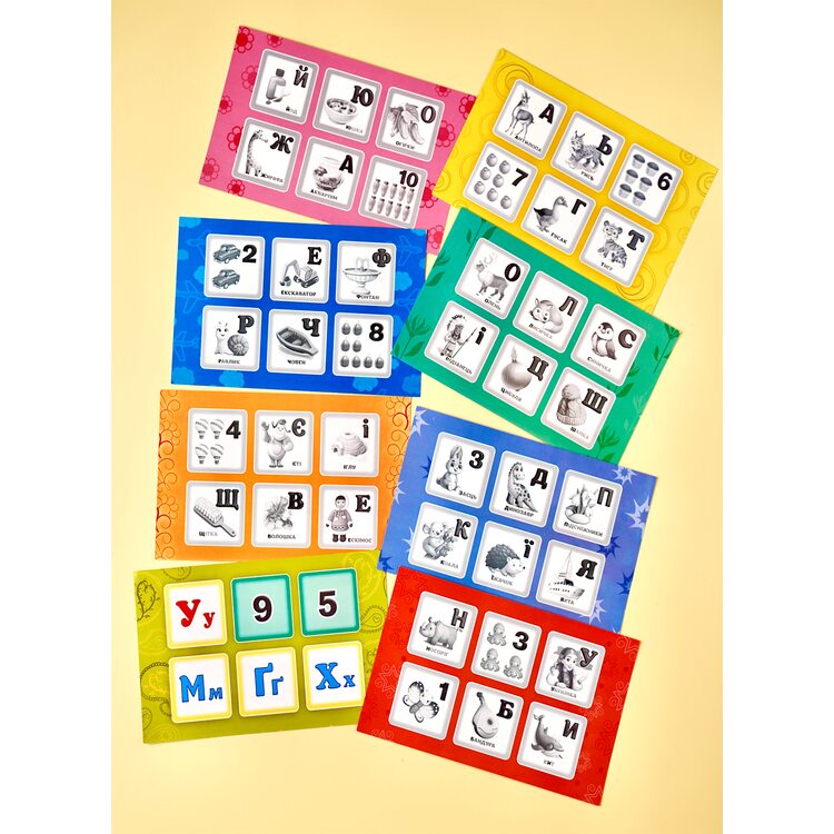 Развивающая игра, которая познакомит ребенка с буквами украинского алфавита и цифрами. В комплект входят 8 двусторонних карточек для лото и деревянные фишки на которых нарисованы буквы украинского алфавита с рисунком и словом, начальная буква которого совпадает с названием изображенного объекта (Например: буква С - нарисована птичка Синица - подписано слово Синичка). Также на фишках изображены цифры с нарисованными объектами, количество которых соответствует изображенной цифре. Всего 48 фишек. Особенностью карточек является, то, что одна из сторон карточек с чёрно-белыми рисунками, а вторая - с нарисованными только цифрами или буквами. Данная особенность значительно усложнит задачу для игроков.