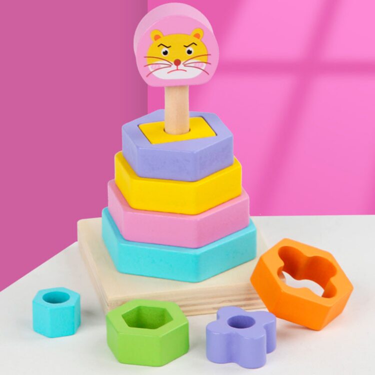 Двухслойная пирамидка с деталями шестиугольной формы. Верхний слой пирамидки внешне выглядит как классическая пирамидка с шестиугольными деталями. Нижний слой - различные геометрические фигуры, размеры которых совпадают с размерами отверстий деталей верхнего слоя.