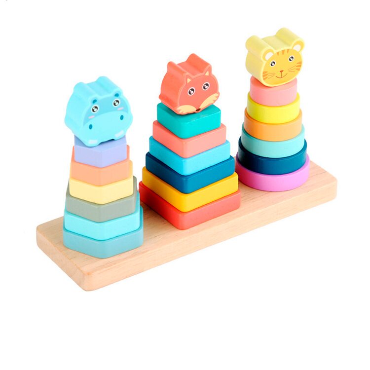 Симпатичные мордашки животных (лиса, бегемот и тигр) вместо классического шарика на верху пирамидок. На основании расположены 3 вида пирамидок с деталями в виде 3-х геометрических фигур: круг, квадрат и шестиугольник. Каждая из пирамидок состоит из 7-ми деталей. Играя, ребенок знакомится с цветами, животными, геометрическими фигурами, учится нанизывать детали, на практике разберётся в понятиях размера "больше-меньше", последовательности. Развивается мелкая моторика, логическое мышление, память.