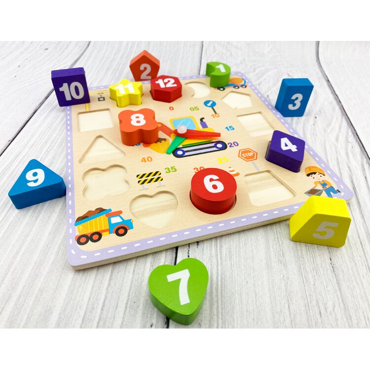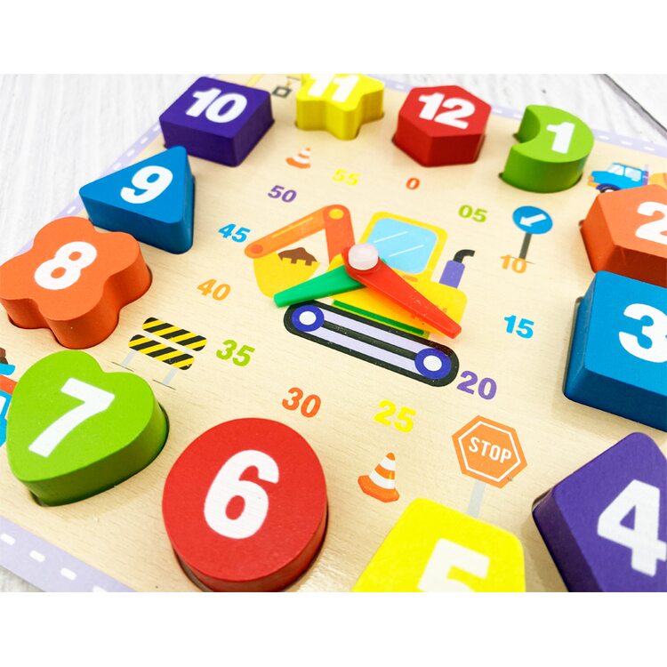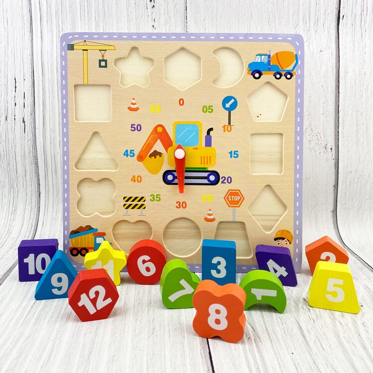 Деревянные часы, где циферблат состоит из разных геометрических фигур. Каждая цифра принадлежит определенной геометрической фигуре и цвету.