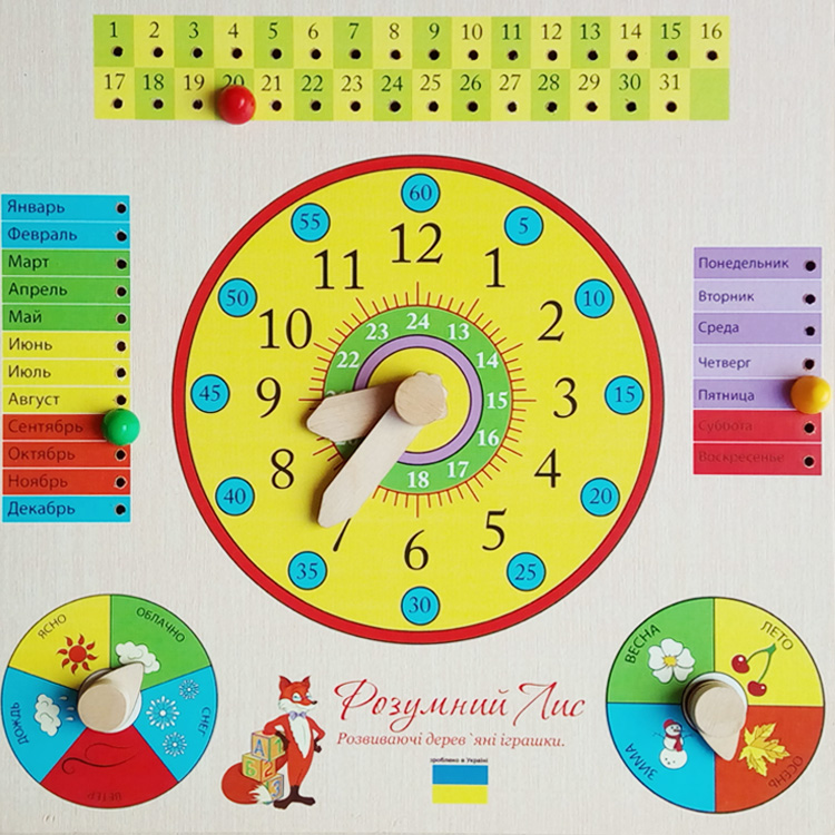 Часы-календарь дисциплинируют ребенка, позволяя играть во взрослые и ответственные игры. С таким великолепным помощником не трудно следить, когда куклам следует обедать и ложиться спать, как одевать мишку на прогулку, в какой из дней недели останутся дома папа и мама и не нужно будет идти в садик. Удобная структура часов-календаря позволяет объяснить ребенку основные принципы отсчета времени, познакомить его с 12-ти и 24-часовым форматом. Обратите внимание: в каталоге представлен вариант данной игрушки в украиноязычном варианте.