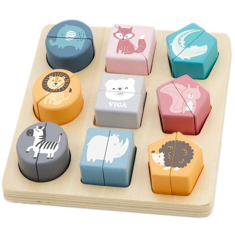 Знакомимся с различными геометрическими формами и разными видами диких животных. На основании расположено 3 вида геометрических форм по 3 варианта (круг, квадрат и пятиугольник), которые состоят из 2-х частей, такой себе мини пазл с изображением животного.