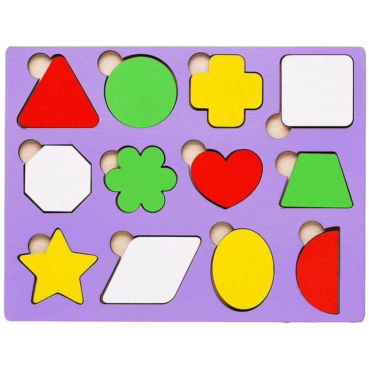 На деревянном основании расположено 12 разных геометрических фигур и форм. Фигуры можно обводить на доске или листе бумаги.