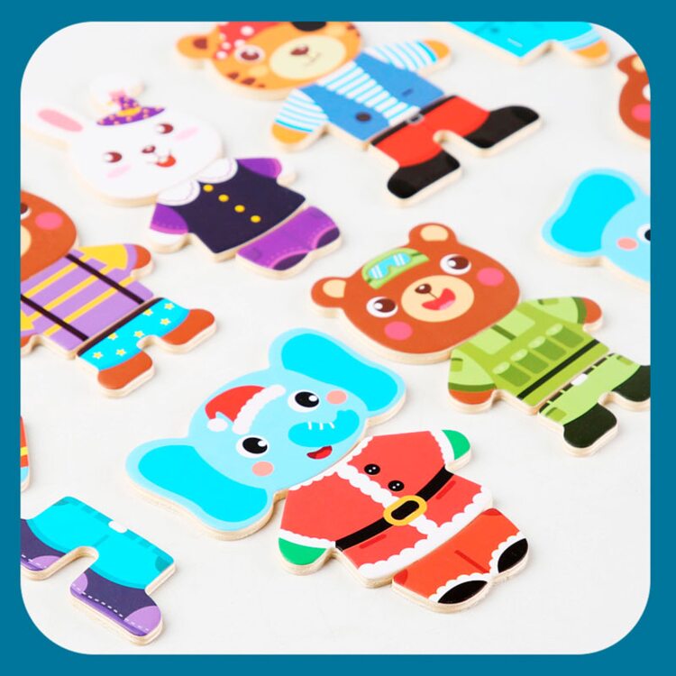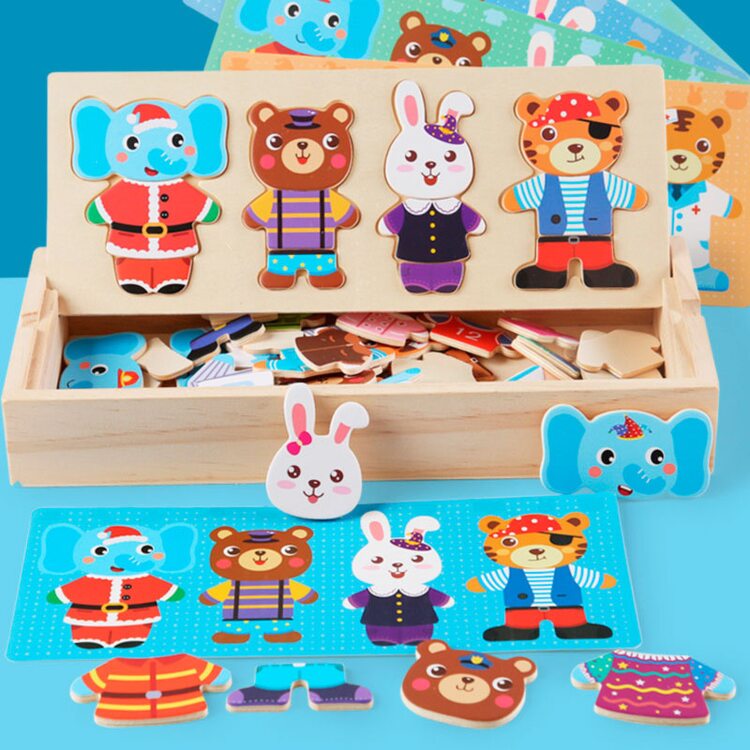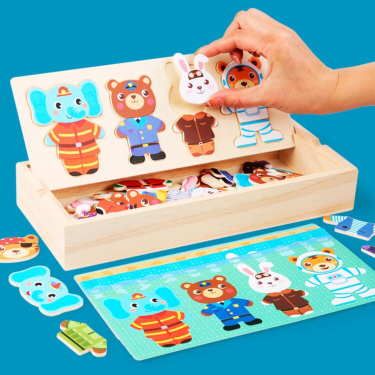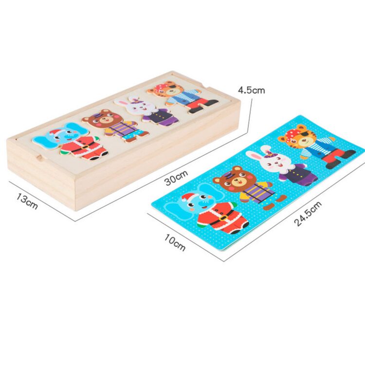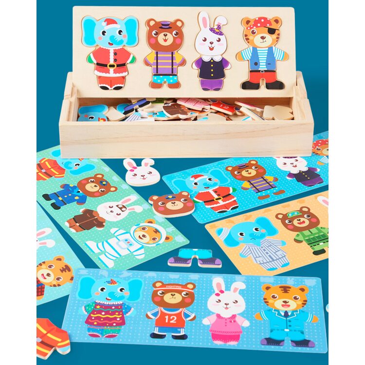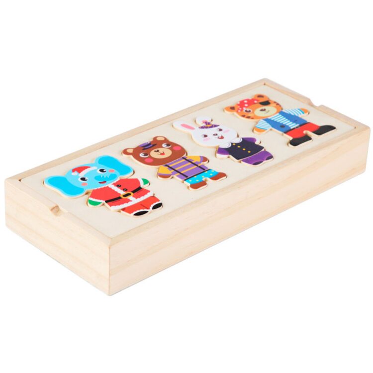 Поиграть в интересную игру вашему малышу поможет деревянный набор-пазл гардероб "Зайчишка и компания". Зверушки очень любит переодеваться, и у каждого из них есть одежда на все случаи жизни: повседневная, для приёма гостей, сна и другие. Также есть несколько вариантов симпатичных мордашек. В наборе всего 60 деталей. Все элементы хранятся в деревянной коробочке, что очень удобно.