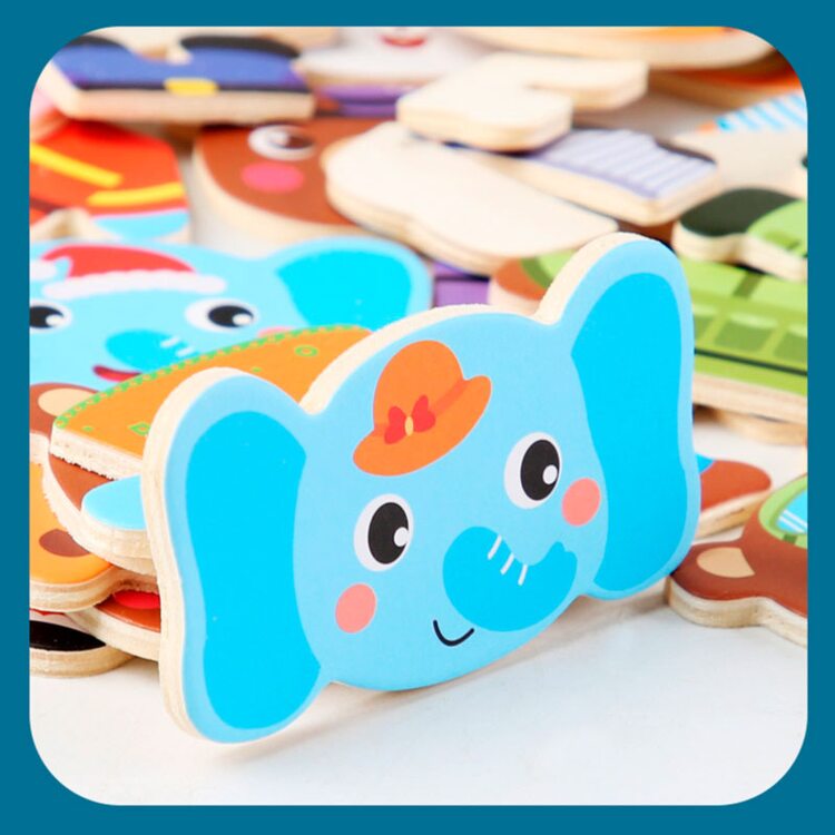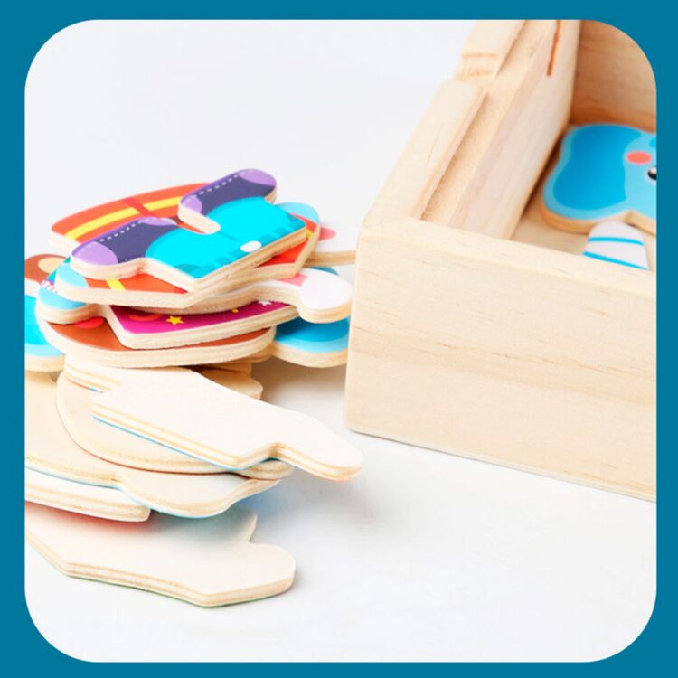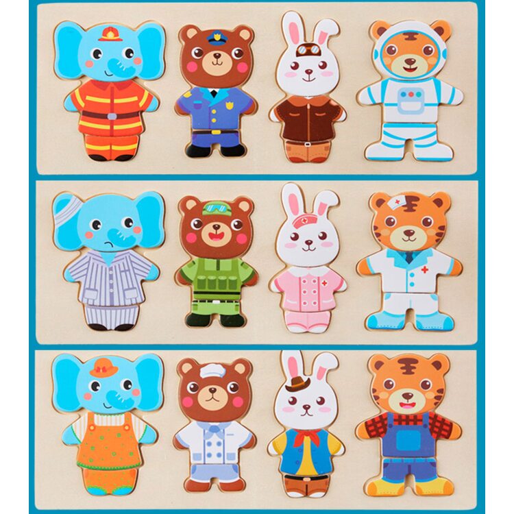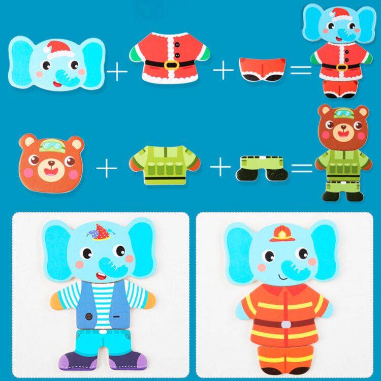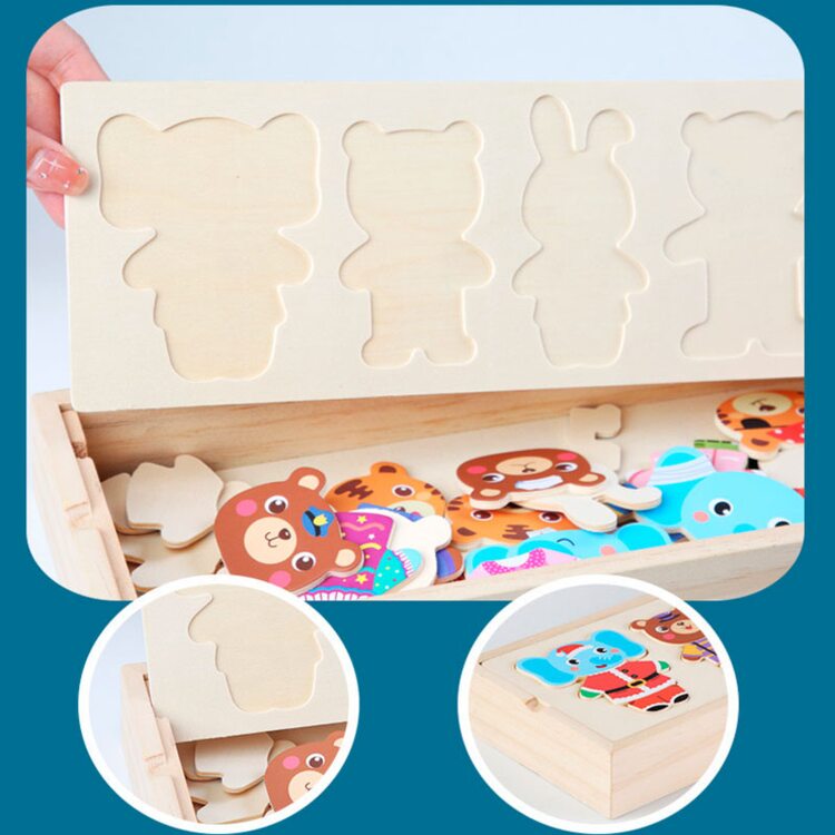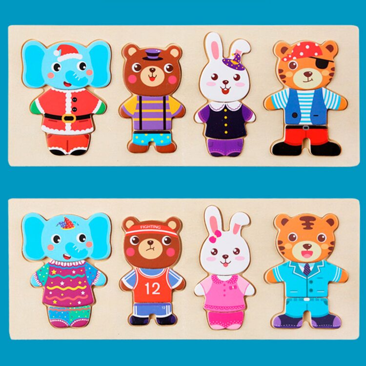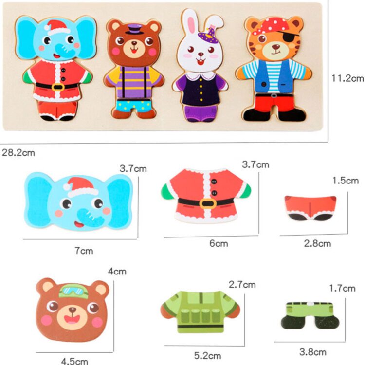 Поиграть в интересную игру вашему малышу поможет деревянный набор-пазл гардероб "Зайчишка и компания". Зверушки очень любит переодеваться, и у каждого из них есть одежда на все случаи жизни: повседневная, для приёма гостей, сна и другие. Также есть несколько вариантов симпатичных мордашек. В наборе всего 60 деталей. Все элементы хранятся в деревянной коробочке, что очень удобно.