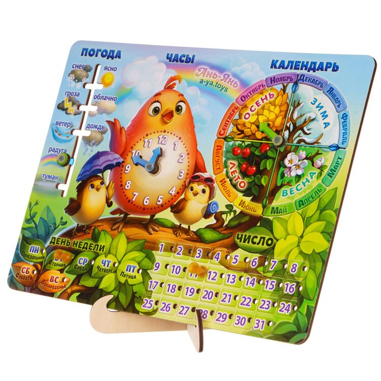 Уникальный деревянный календарь от фирмы Ань-Янь позволит расширить кругозор ребенка. На календаре можно выставить дату или времена года. Игрушка поможет сориентировать малыша во времени, числах и днях недели. Также, посмотрев на погоду за окном, можно выставить ее и на календаре, попутно рассказав ему какая она бывает. Деревянный календарь познакомит ребенка с понятием времени, месяцами и приучит его к порядку.