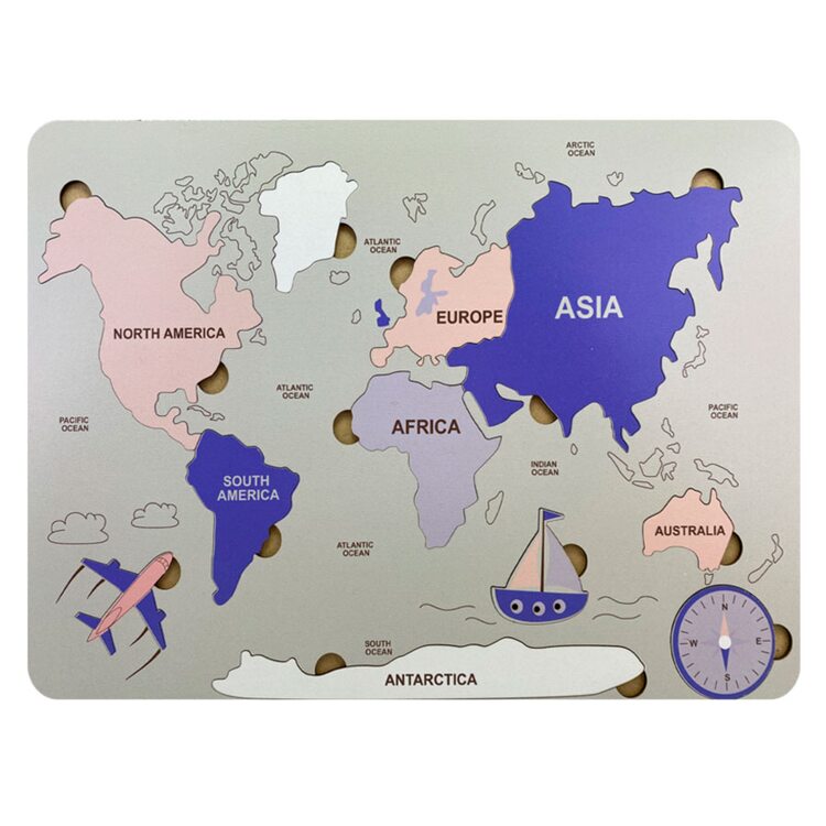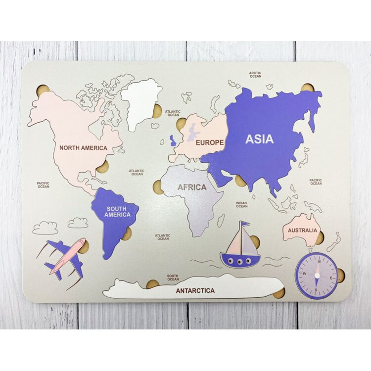 Большого размера мозаика для детей дошкольного возраста. Играя, ребенок выучит название материков, частей мира и океанов, сможет показывать их на карте. На основании размещено 7 вкладышей в виде материков и частей мира, 1 - в виде острова, 3 - в виде самолета, корабля и компаса. Вот так просто в игровой форме Ваш ребенок запомнит и освоит материал школьного предмета. Надписи на основании на английском языке.